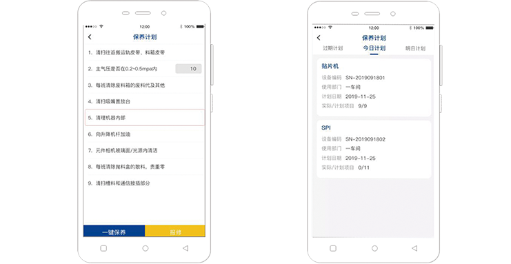① 支持多种计划方式:周期、、、、间隔、、生产次数              ② 保养情况日历表,,,,直观展示             ③ 计划逾期项目置顶,,,,颜色标识区分              ④ 支持移动作业方式 (扫码确认保养点检内容)