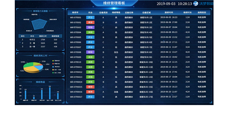 ① 维修信息:实时显示未完成的维修工单信息、、进行看板预警             ② 设备效率:进行设备OEE的统计分析,,,,提高设备管理