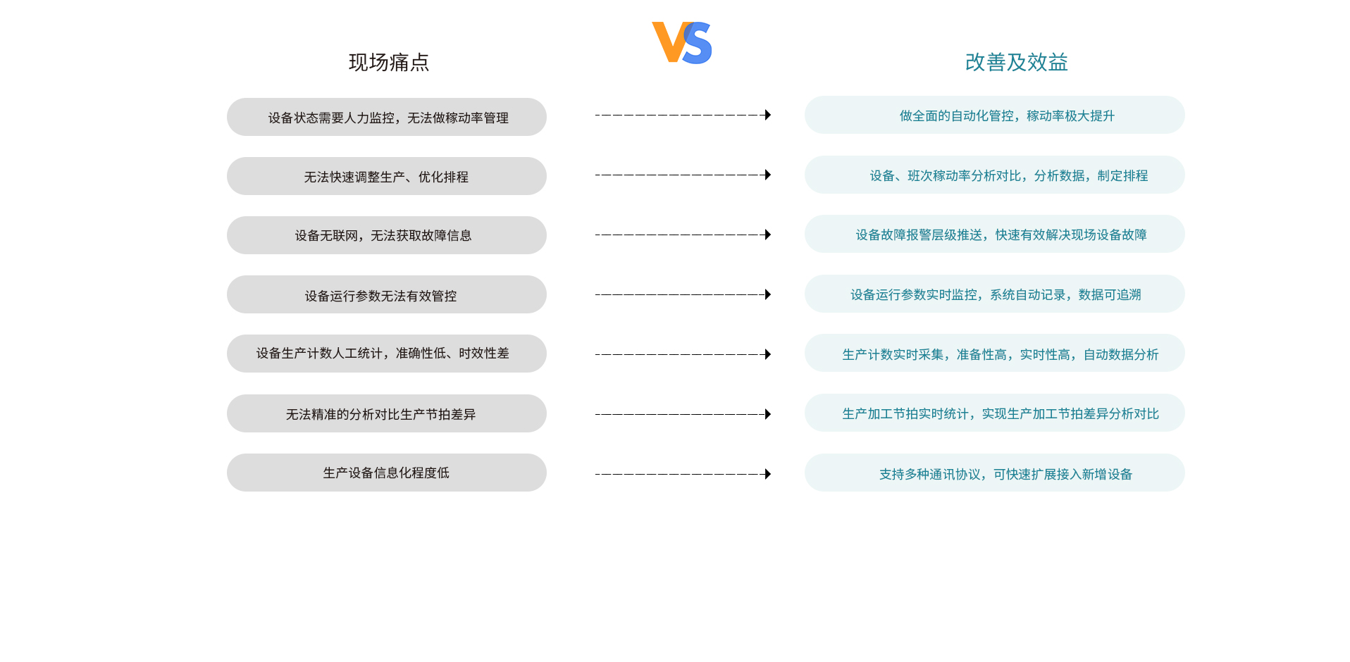 设备实时状态采集(运行、、、空闲、、、报警等状态)及设备利用率分析,,提高设备运行效率,,,调整产线平衡,,消除生产瓶颈。。。。设备运行参数采集分析,,,,提高生产产品质量,,并记录生产数据,,便于质量追溯。。。实现对全厂设备实时监控,,,, 并通过数据报表及实时预警提示,,辅助设备运维管理。。。